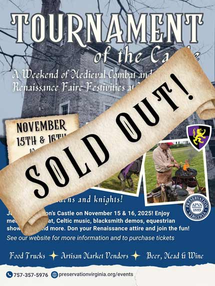 The event will take place rain or shine, and no refunds will be issued unless the event is canceled by Preservation Virginia. Located at Bacon’s Castle, 465 Bacon’s Castle Trail, Surry, VA 23883.