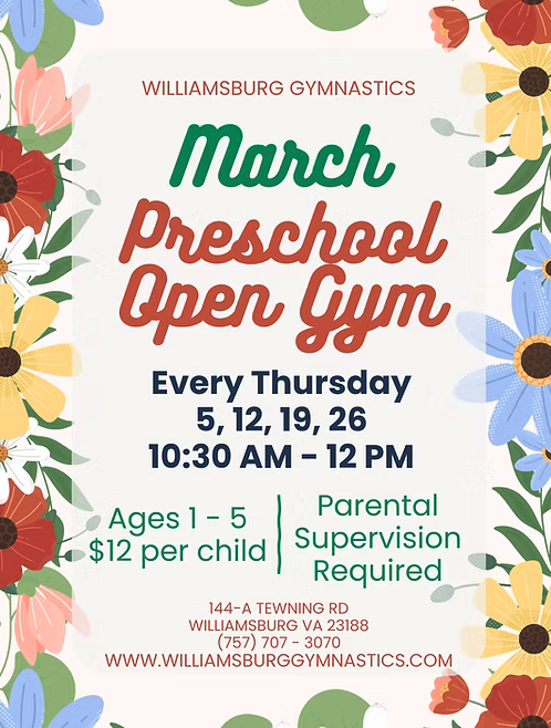 Parental supervision required. Advanced registration guarantees a spot. Walk ins welcome, but admission is based on capacity. Register at www.williamsburggymnastics.com/open-gyms