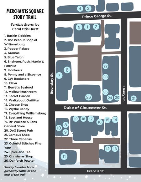 Looking for a fun, free outdoor activity with the kids? Head down to Merchants Square and follow the story! As you take a walk through Merchants Square and read Terrible Storm by Carol Otis Hurst . Download the map or pick up a map at the Williamsburg Library and read the story page by page in the windows of participating businesses in the Merchants Square.