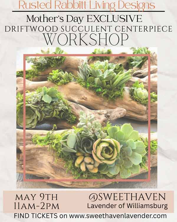 Join local grower and living design artist Melissa Tebbenhoff as she guides you through a hands-on succulent driftwood workshop on Saturday, May 9 from 11 am – 2 pm at Sweethaven Lavender of Williamsburg.