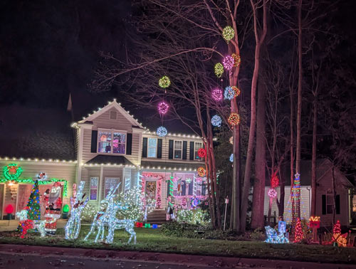 12 Huntington Dr. Williamsburg VA- The display can’t be missed. There are so many lights that it can be seen from the main road off John Tyler Highway. It gets better each year. Find it on our Shimmer & Shine Holiday Lights Contest & MAP