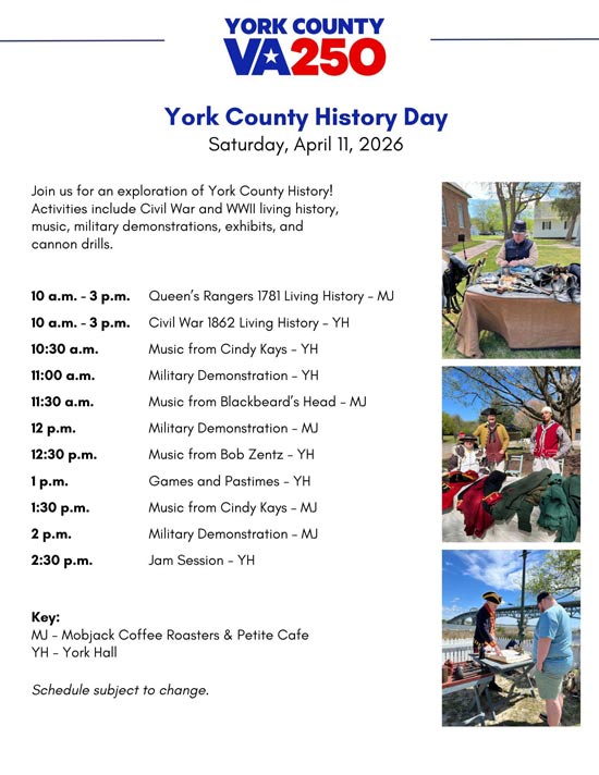 Come for a celebration of York County History. This event highlights the American Revolution and Civil War. This event highlights the American Revolution and Civil War. Enjoy music, military demonstrations, crafts, food, and more at the Watermen’s Museum and York Hall. The schedule is subject to change. Scroll down for schedule