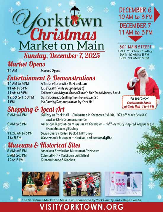 Yorktown’s Christmas Market on Main Street is the event shoppers look forward to all year. Vendors, artists, food trucks, strolling musicians, and antique cars line the street in Historic Yorktown. They will have chestnuts roasting on an open fire, free kids’ activities, a performance by the Fifes and Drums of York Town, and even a visit from Santa himself!