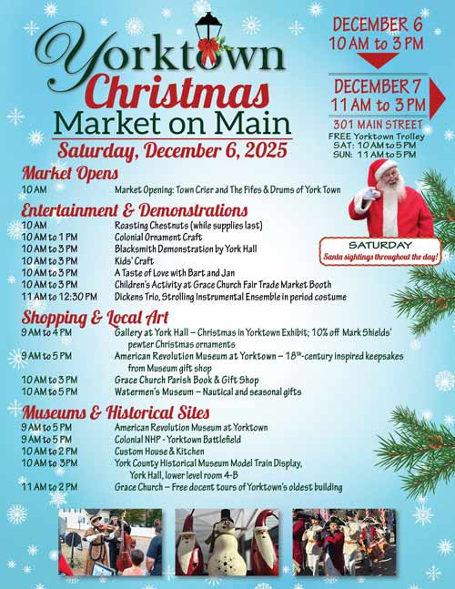 The Yorktown Trolley runs beginning at 11 am and will provide complimentary transportation. The Trolleys are heated and wheelchair accessible, and make several stops throughout town including the lots at the County Administration building, Yorktown Battlefield Visitor Center, Watermen’s Museum, and American Revolution Museum at Yorktown.